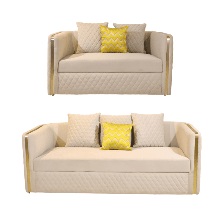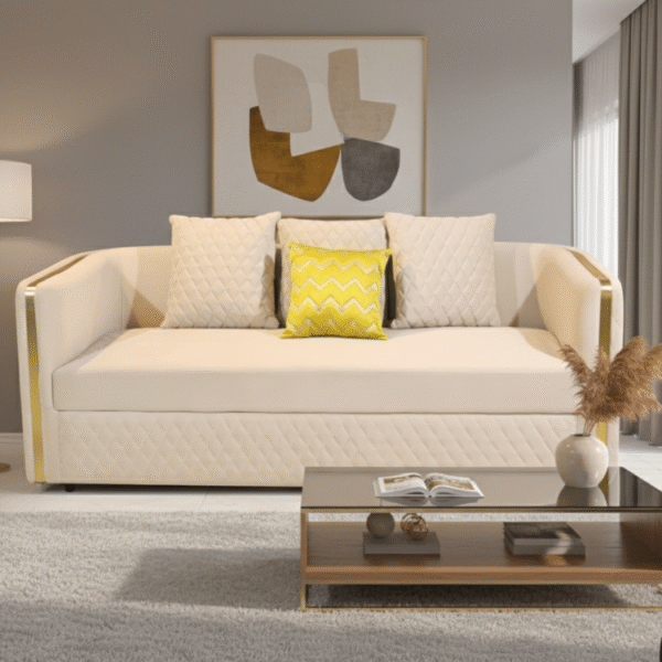 The Aurora Crest Sofa radiates refined charm with quilted cream upholstery, golden arm accents, and plush cushions. A bold yellow pillow adds a pop of personality, perfect for luxe interiors with a modern twist.