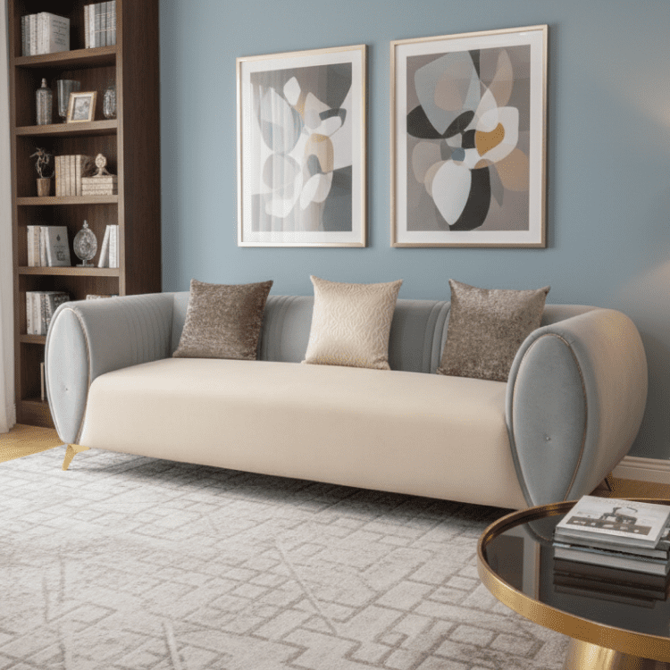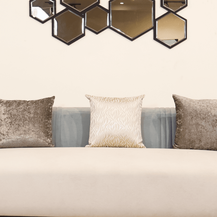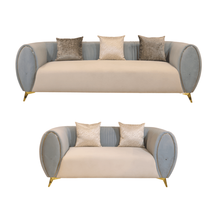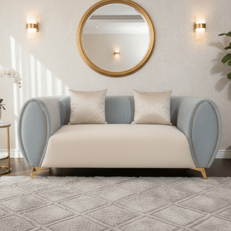 Blue Beige Bliss blends soft tones and plush comfort in a refined sofa set. With elegant armchairs, geometric mirrors, and swirl-patterned rug, it creates a serene, stylish centerpiece for modern living spaces. Available in 2-seater, 3-seater, and full set options.