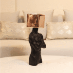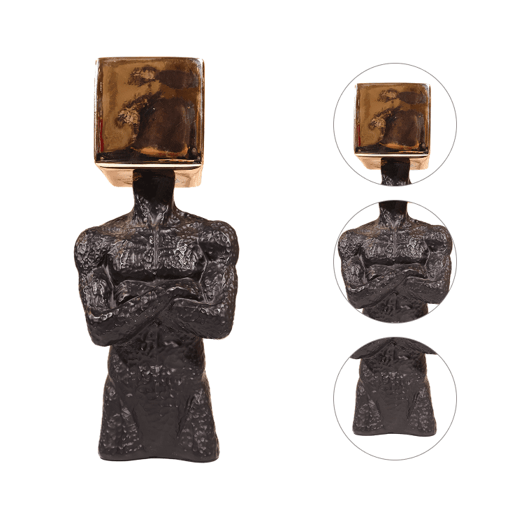 Box-Head Sentinel is a striking modern sculpture featuring a textured black torso and a polished copper cube head. Bold, artistic, and conversation-worthy—perfect for contemporary home or office décor.