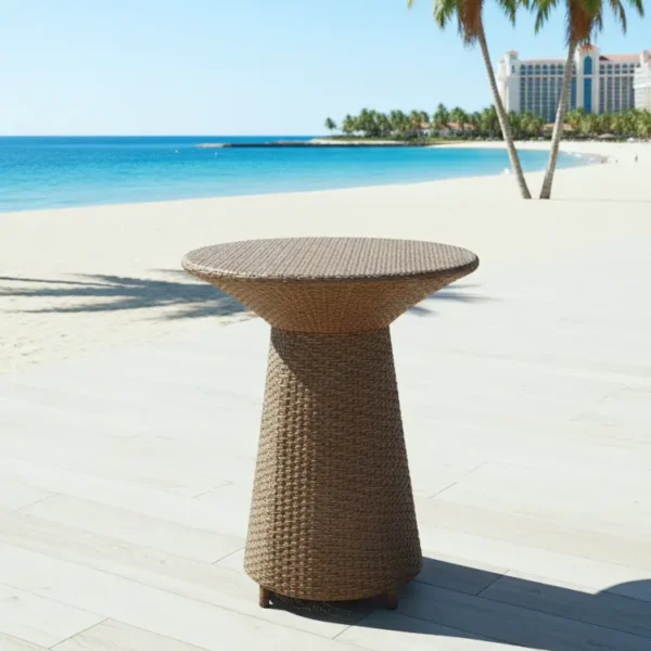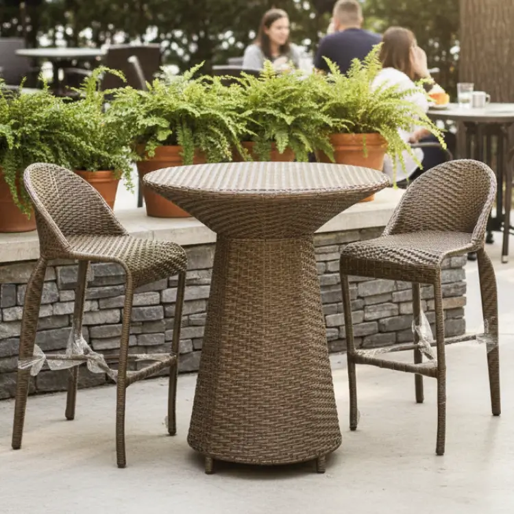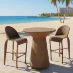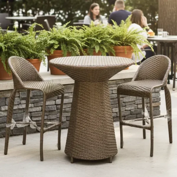 Create a resort ambiance on your deck or patio with this Brown Woven Bar Set. This eye-catching, high-top set features two comfortable, contemporary bar stools and a sleek pedestal table. Crafted from durable, warm brown all-weather wicker, it’s ideal for enjoying elevated views and outdoor cocktails.