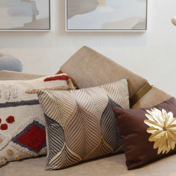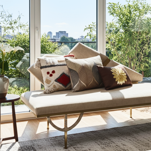 The Champagne Crest Couch features light beige upholstery, diamond-shaped back cushions, and gold metal accents wrapped in white rope. Its sculptural form and refined detailing add artistic elegance to minimalist, nature-inspired interiors.
