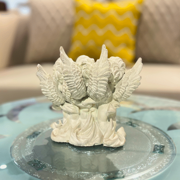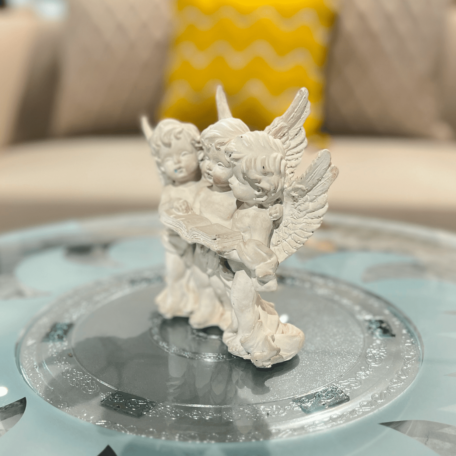 This elegant sculpture features three cherubic figures with delicate wings, gathered around an open book. Perfect for mantel or tabletop display, it evokes themes of unity, innocence, and timeless charm in any serene setting.