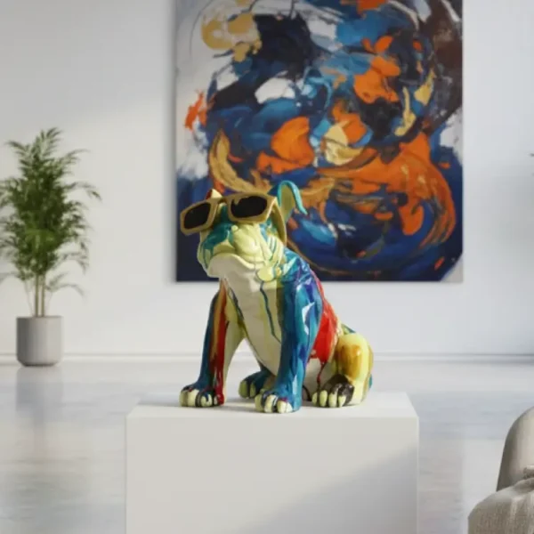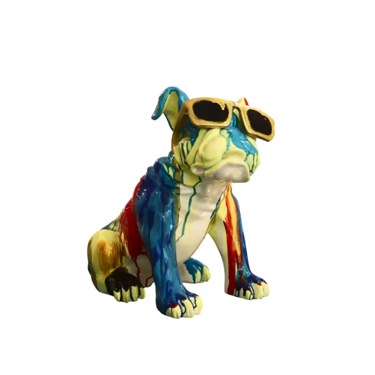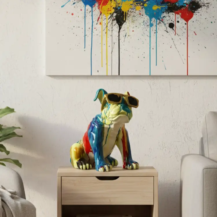 This ceramic bulldog sculpture features vibrant dripping colors and glossy finish, complete with playful sunglasses. A bold, modern accent piece that adds personality and pop-art charm to any interior setting.