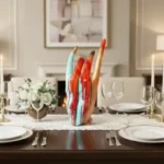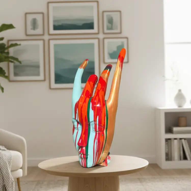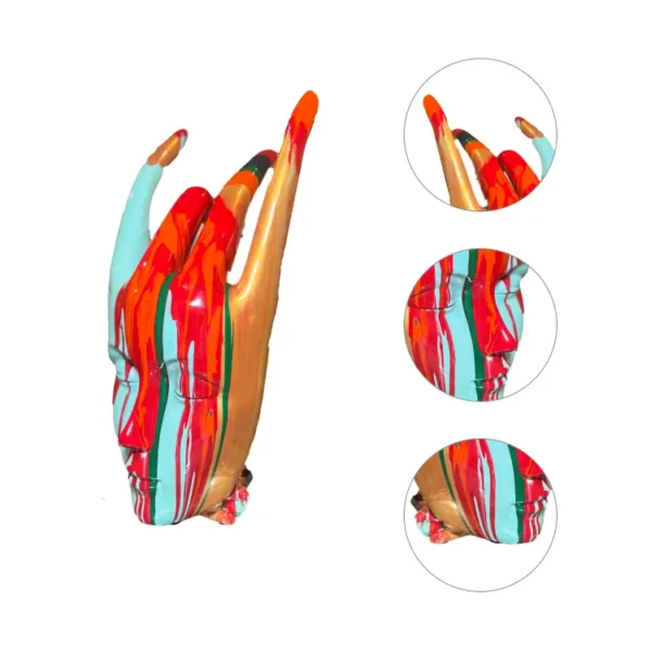 Colorburst Hand Sculpture features a stylized hand with flame-like extensions and a glossy blend of red, turquoise, gold, and green. A bold centerpiece that adds expressive energy and modern art flair to any space.