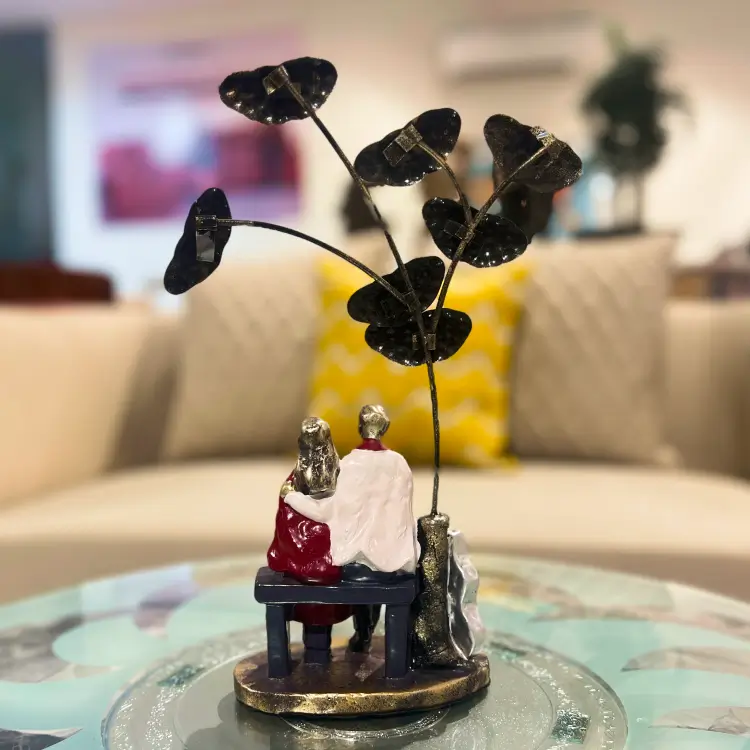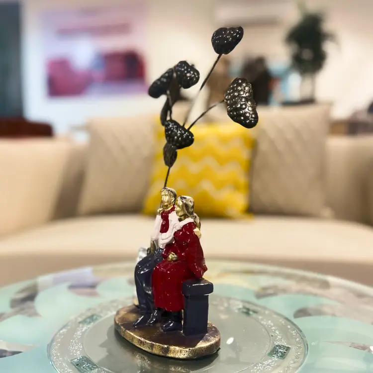 A romantic sculpture of a couple seated beneath golden leaves, capturing warmth and togetherness. With rich red tones and elegant detailing, this piece adds charm and intimacy to any modern decor setting.