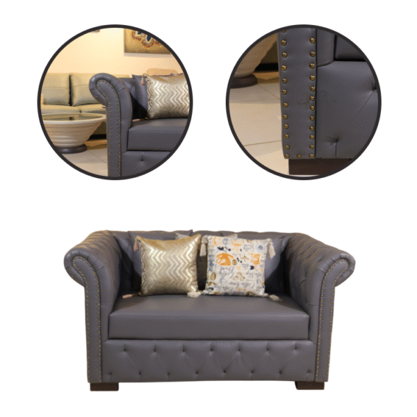 Cushion Craft couch blends classic tufted elegance with modern comfort. Featuring nailhead trim, plush cushions, and stylish pillows, it’s the perfect centerpiece for cozy corners and refined living spaces.