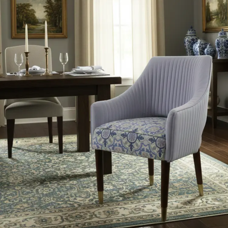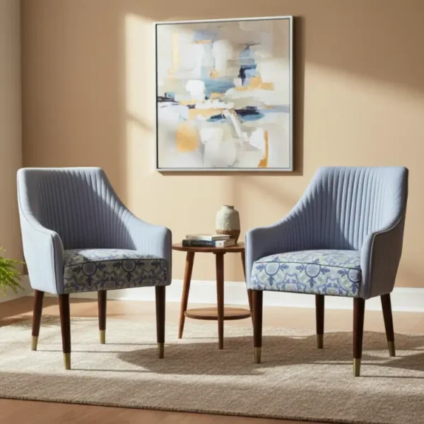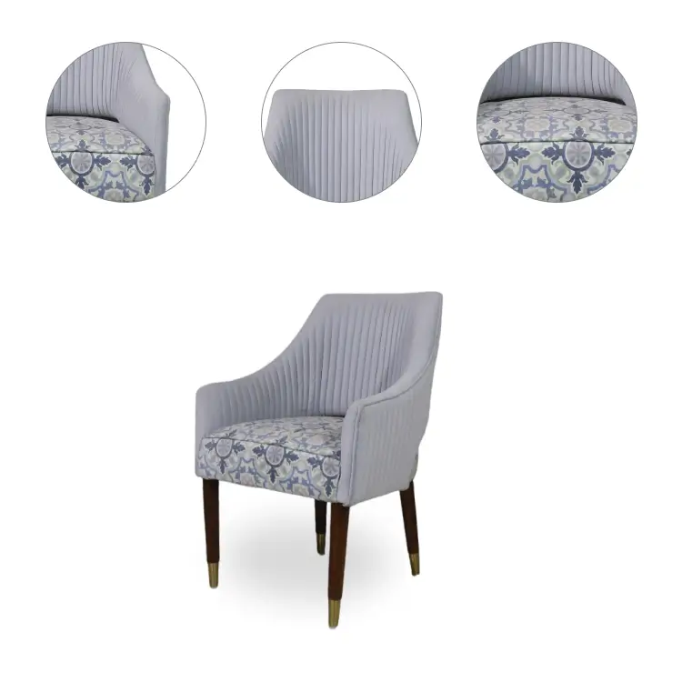 Elevate your space with the Deco Chair, featuring printed blue upholstery, elegant teak wood legs, and golden caps. A perfect blend of charm and sophistication for modern or eclectic interiors.