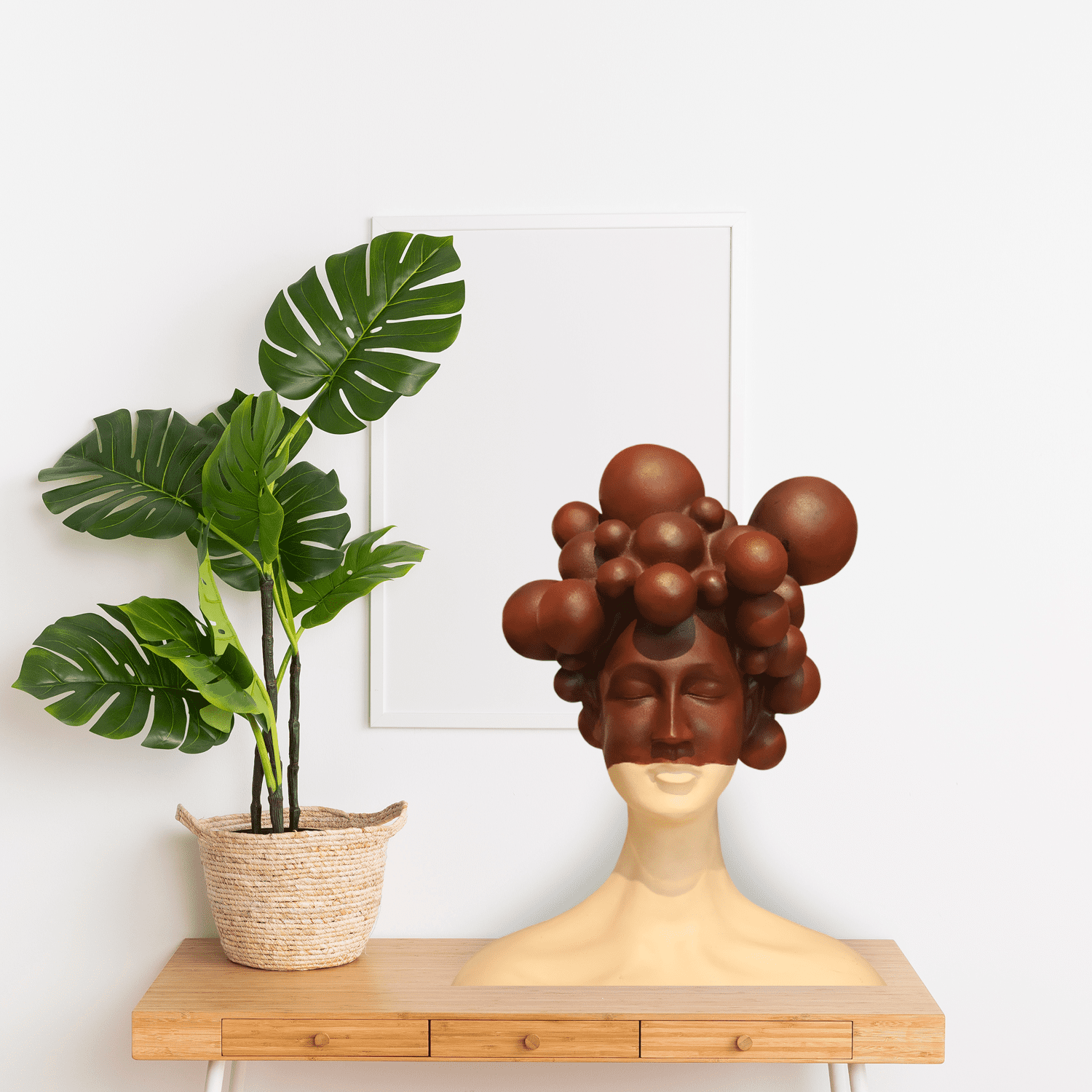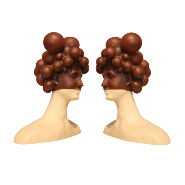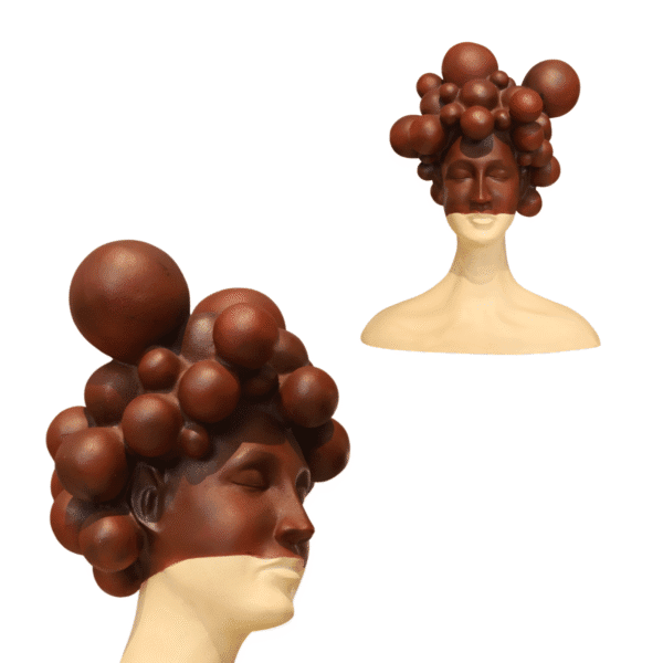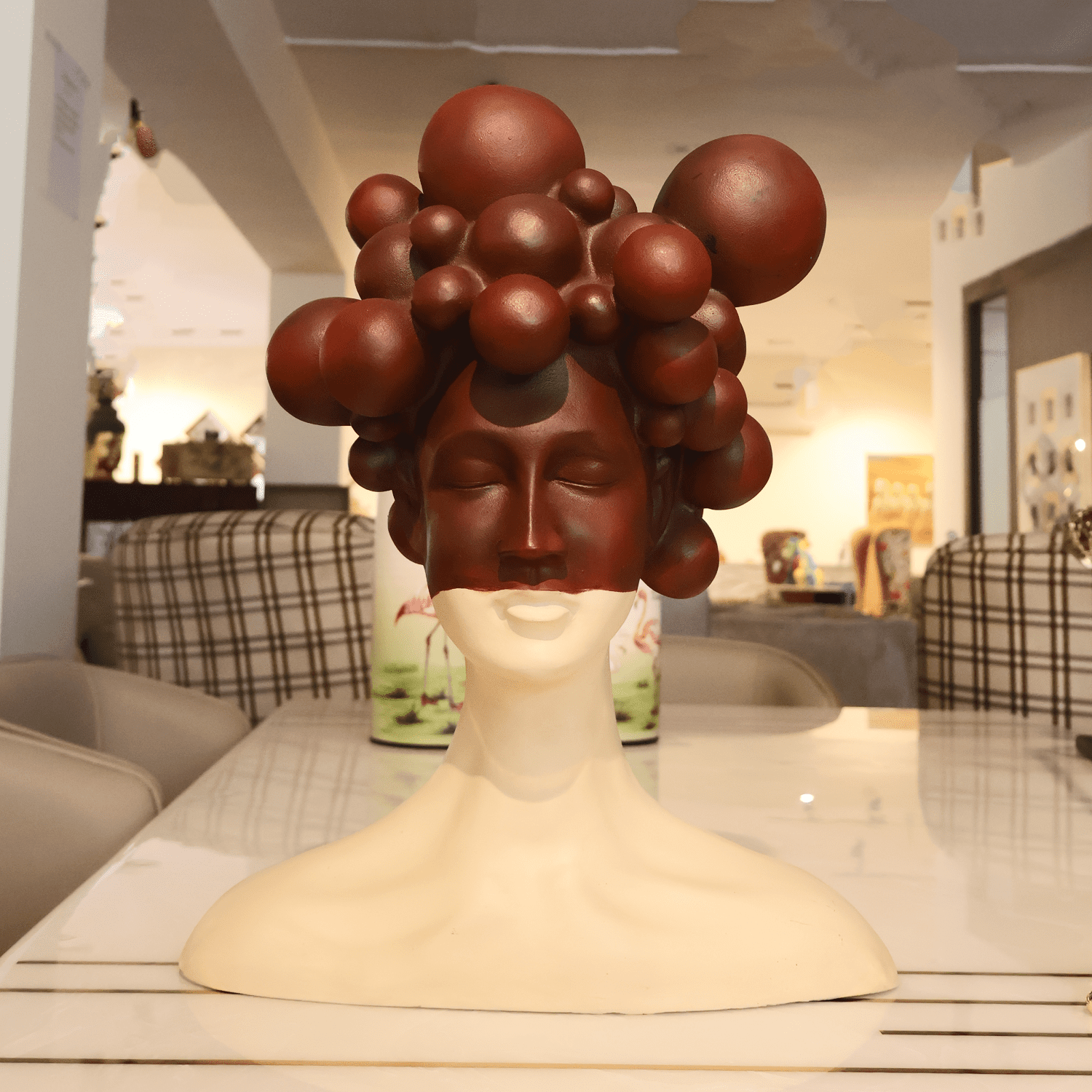 This locally crafted sculptural bust features a serene expression and abstract hair design. With its striking contrast of cream and dark tones, it adds artistic flair and modern elegance to any curated space.