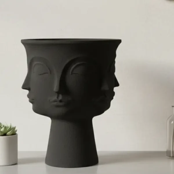 Textured and expressive, this sculptural vase features stylized faces in quiet contemplation. Its matte black finish and bold form make it a striking accent for modern interiors with artistic depth.
