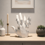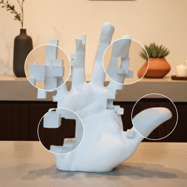 The Fragmented Reach Sculpture blends human form with digital abstraction, featuring a pixelated white hand. Paired with minimalist decor, it evokes modern introspection and adds conceptual depth to curated interior vignettes.