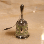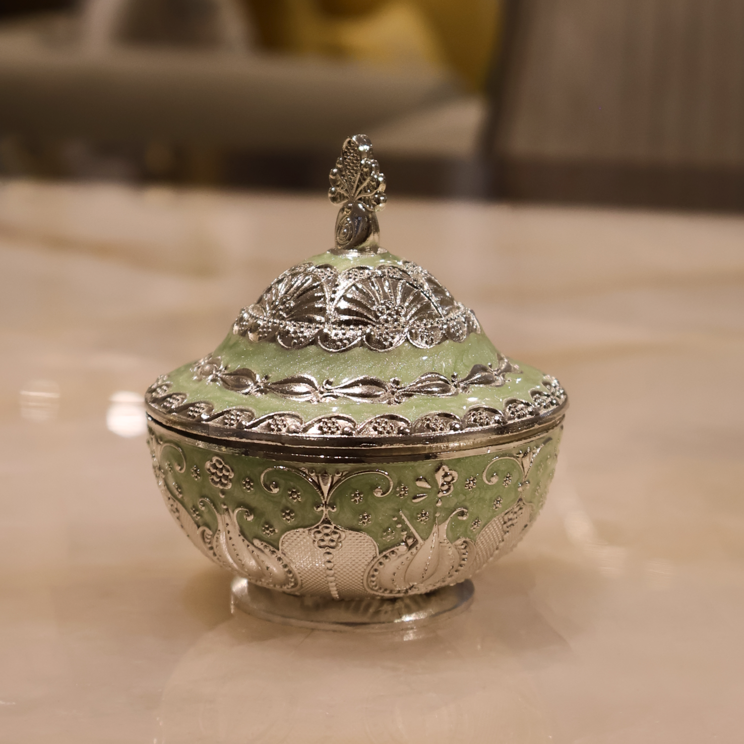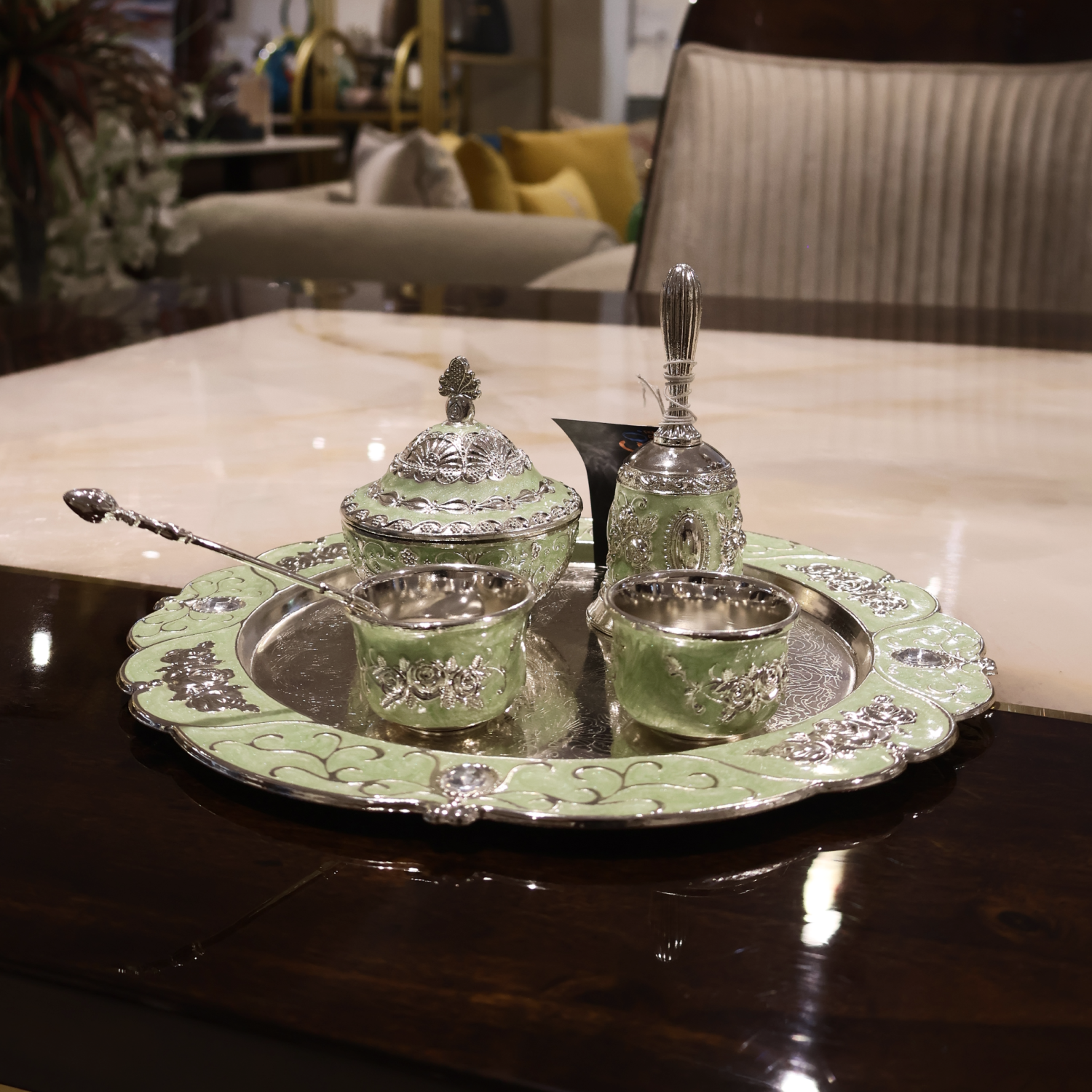 This handcrafted German silver plate features a stunning green accent that adds elegance to any setting. Ideal for festive decor or ceremonial use, its intricate detailing and lustrous finish evoke timeless traditional charm