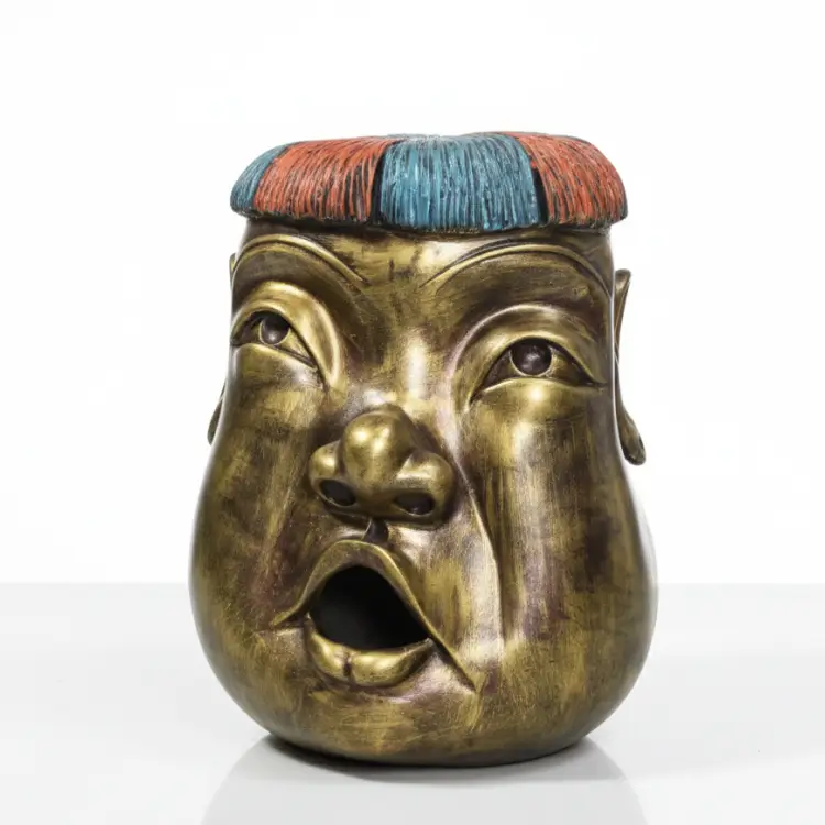 Make a dramatic statement with this Gold Grotesque Head Ornament. Finished in a striking distressed gold, this sculpture features an exaggerated facial expression and a colorful, textured ‘hairpiece.’ Use this unique, conversation-starting piece to introduce ancient, tribal-inspired flair to your contemporary interior design.