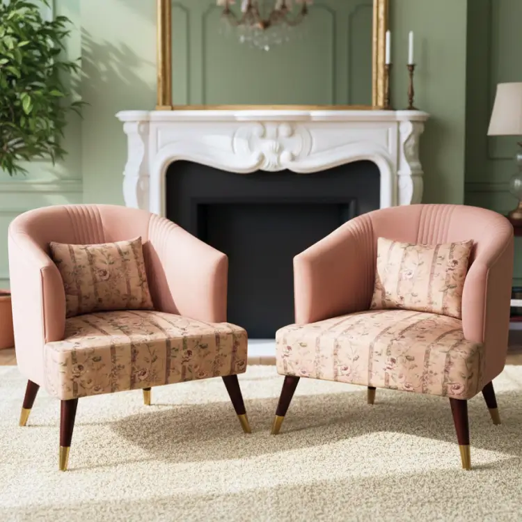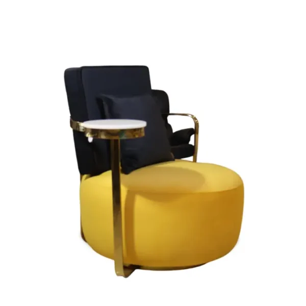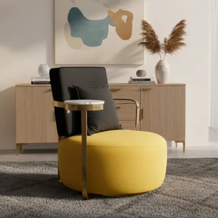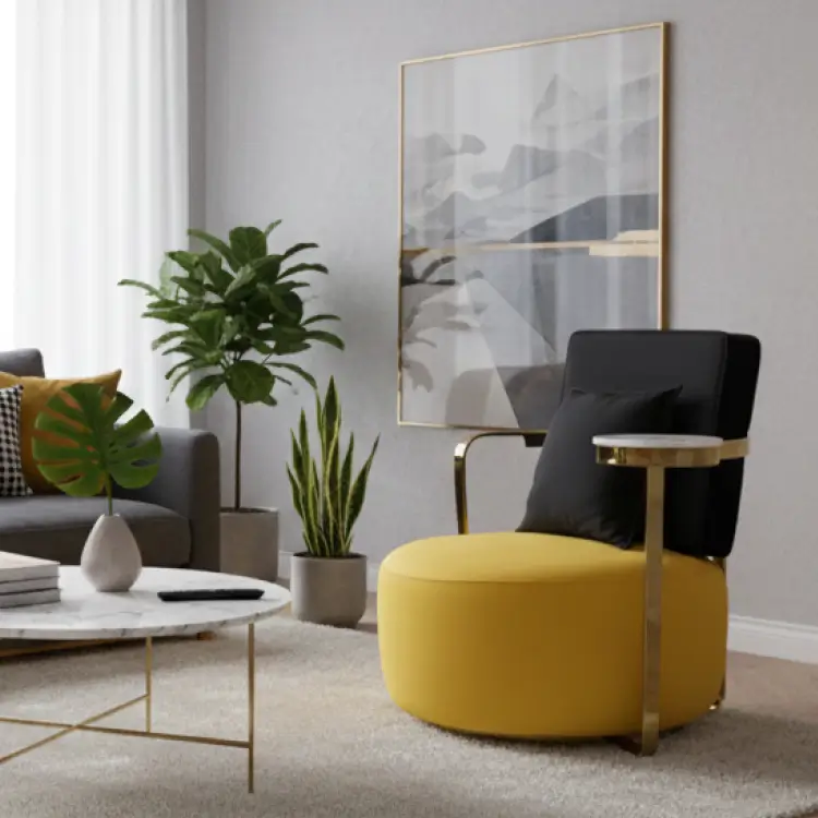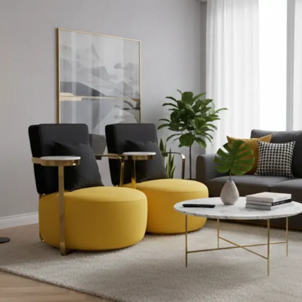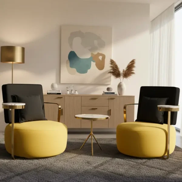 The Golden Arc Lounge Set features yellow-cushioned armchairs with black backs and gold armrests, paired with marble-topped tables. Framed by soft art and pampas accents, it blends bold elegance with relaxed modern charm.
