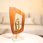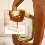 Golden Axis Sculpture blends geometric wood framing with a striking gold metal form, anchored on a stone base. A bold statement piece, it adds depth and elegance to consoles, shelves, or curated decor vignettes.