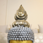 This elegant Golden Buddha Statue features intricate detailing, with a serene expression and a beautifully sculpted flame atop the head. A symbol of peace, wisdom, and spiritual harmony, it enhances any space.