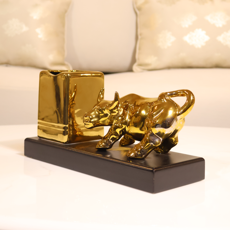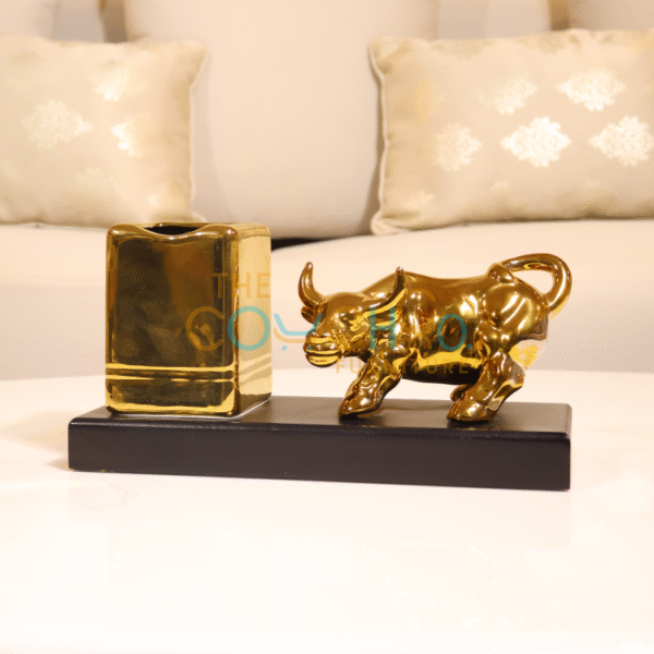 This stylish Golden Bull Pen Stand combines elegance with functionality. Featuring a sleek black base and a polished bull sculpture, it adds a touch of sophistication to your workspace or desk.