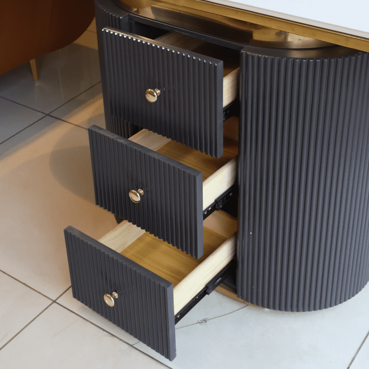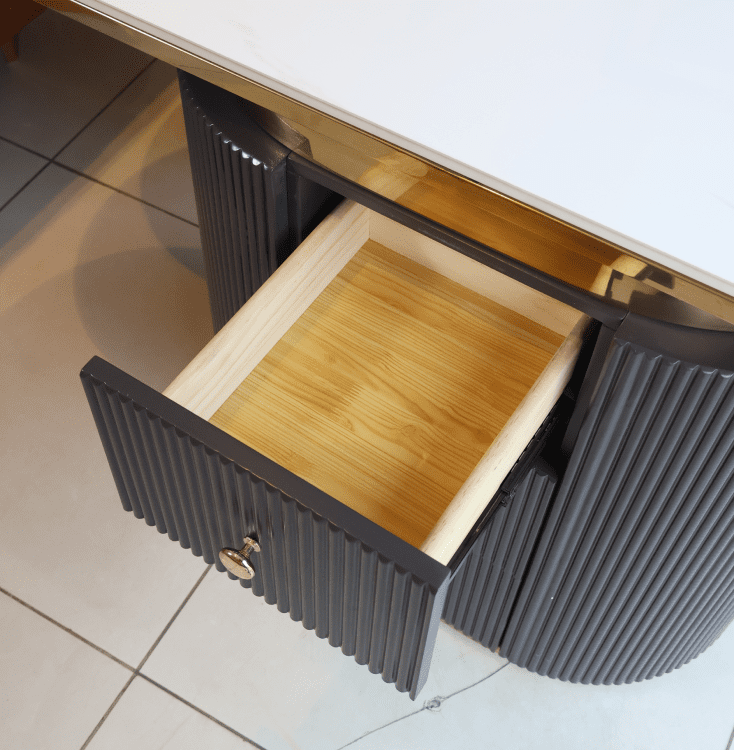 The Golden Crest Console pairs a glossy ivory top with radiant gold trim and a dark grooved base. A striking blend of elegance and utility, it anchors modern interiors with timeless sophistication and sculptural charm.