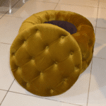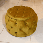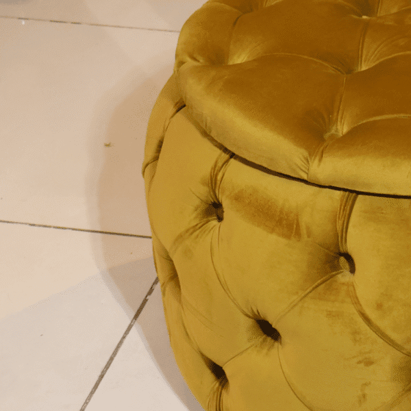 Golden Nest Stool combines plush comfort with modern elegance. Upholstered in mustard yellow tufted fabric, its circular design offers versatile use as seating, footrest, or accent. Crafted with button detailing, it enhances contemporary interiors effortlessly.