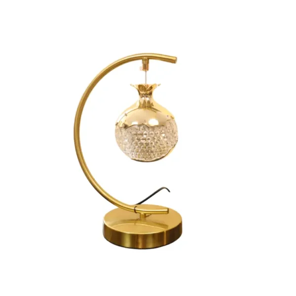 This artistic table lamp features a golden arc frame and a pomegranate-inspired pendant with crystal texture. Elegant and functional, it adds a luxurious glow and sculptural charm to desks, consoles, or bedside tables.