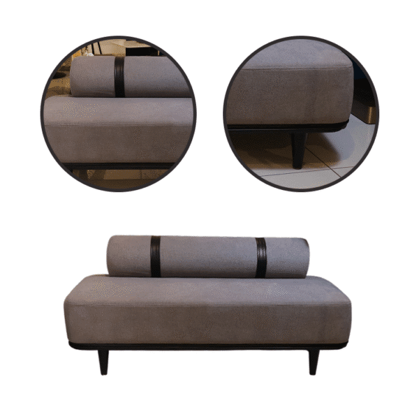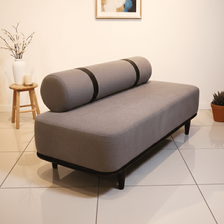 The Graphite Couch features muted gray upholstery with bold black accents and a sculptural cylindrical backrest. Its minimalist form and low-profile base bring modern elegance to refined interiors with artistic flair