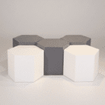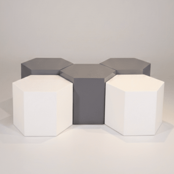 Hexagon Ottoman Set features six hexagonal units in gray and white, arranged in a honeycomb layout. A geometric seating solution that adds modular charm and flexible functionality to modern lounges or creative living spaces.