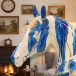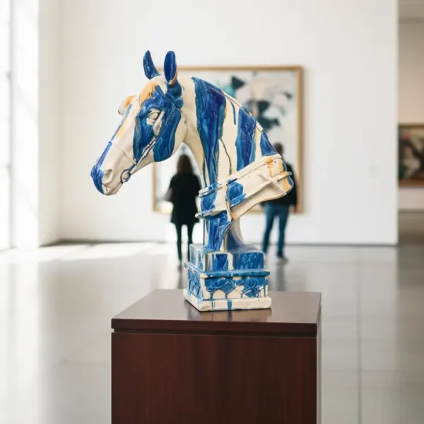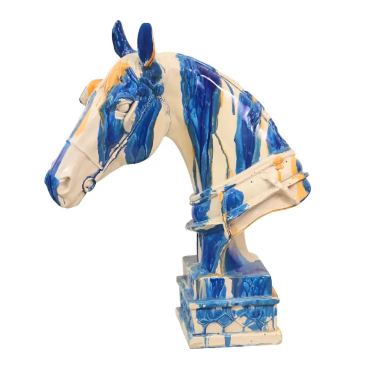 This handcrafted ceramic horse head features bold blue, orange, and white glazes, sculpted with elegance and mounted on a textured pedestal — a vibrant accent for any artistic space.
