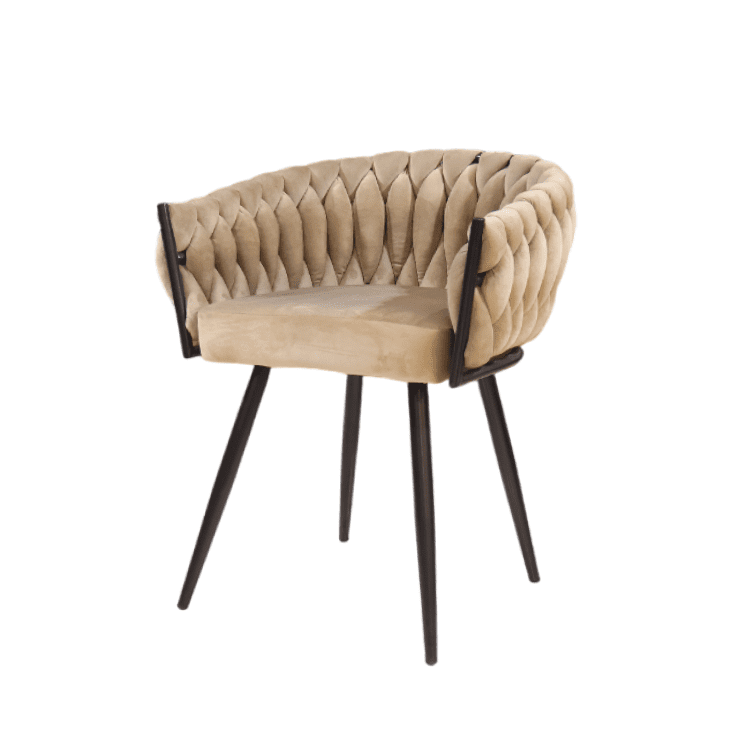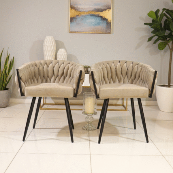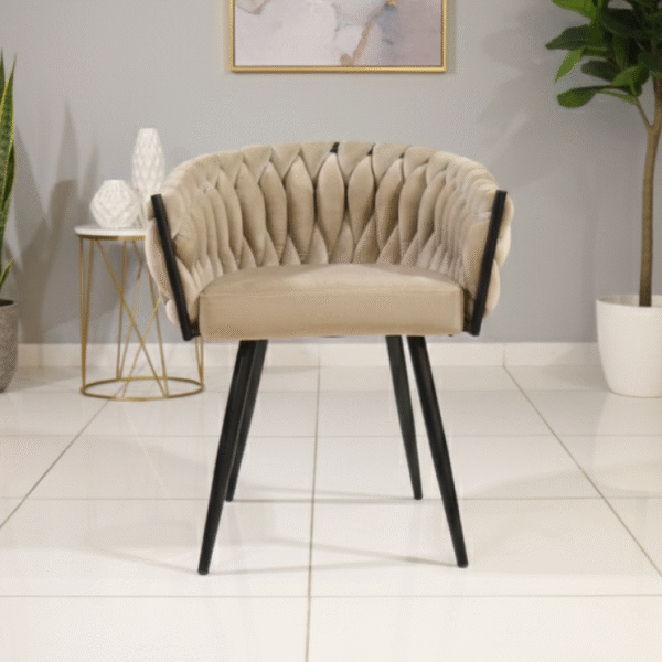 Ivory Crest Chair exudes timeless elegance with its tufted beige upholstery, sleek black legs, and refined silhouette. Perfect for living rooms or lounges, it adds warmth and sophistication to any contemporary interior.