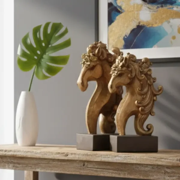 This elegant pair of decorative horse sculptures features intricate detailing, flowing manes, and a refined antique finish. Perfect for enhancing living rooms, offices, or display shelves, they bring a touch of sophistication and artistic charm to any space.