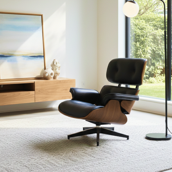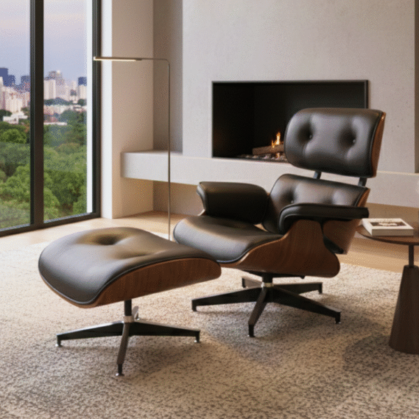 The Midnight Curve Lounge features black leather upholstery and molded wood contours. Paired with a matching ottoman, it offers timeless comfort and style—ideal for serene city-view interiors and modern relaxation zones.