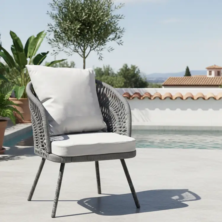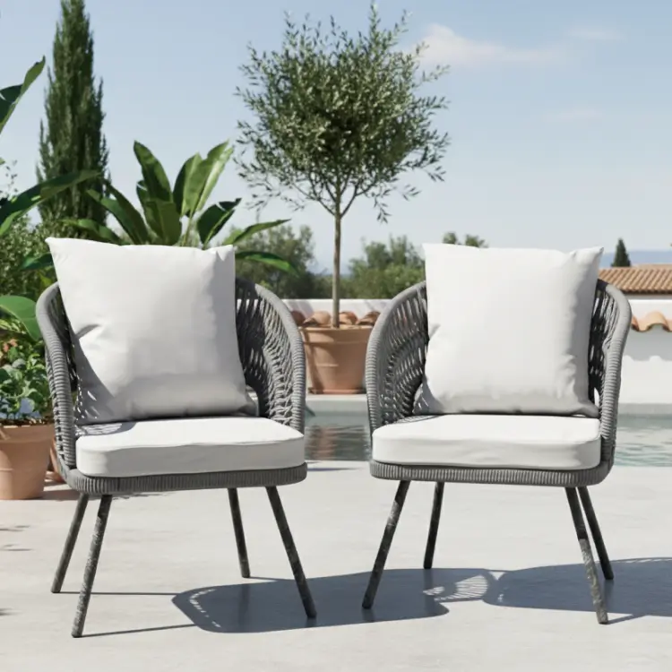 Introduce high-end style to your patio with the Modern Rope Bistro Set. This sophisticated 3-piece set features two chairs wrapped in a durable, contemporary grey rope weave, providing superior texture and comfort. Paired with crisp white cushions and a glass-top round table, it’s the perfect chic focal point for smaller outdoor areas.