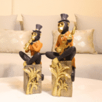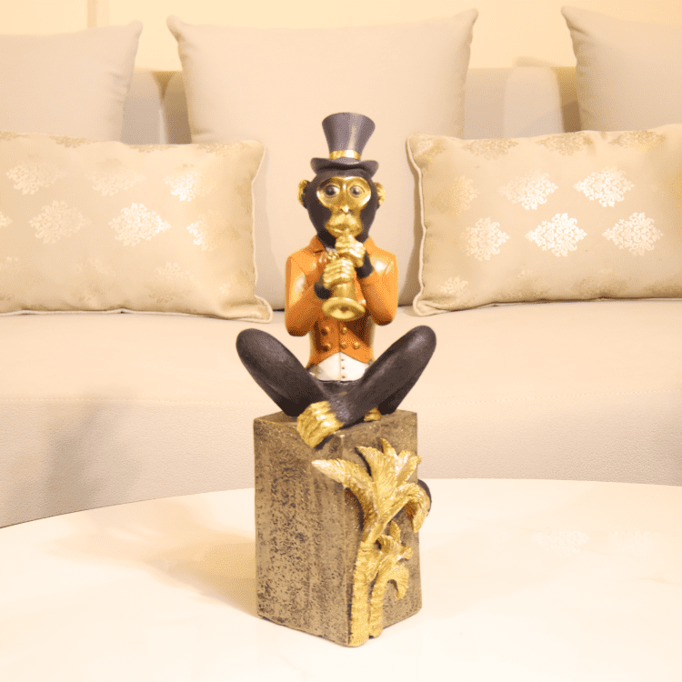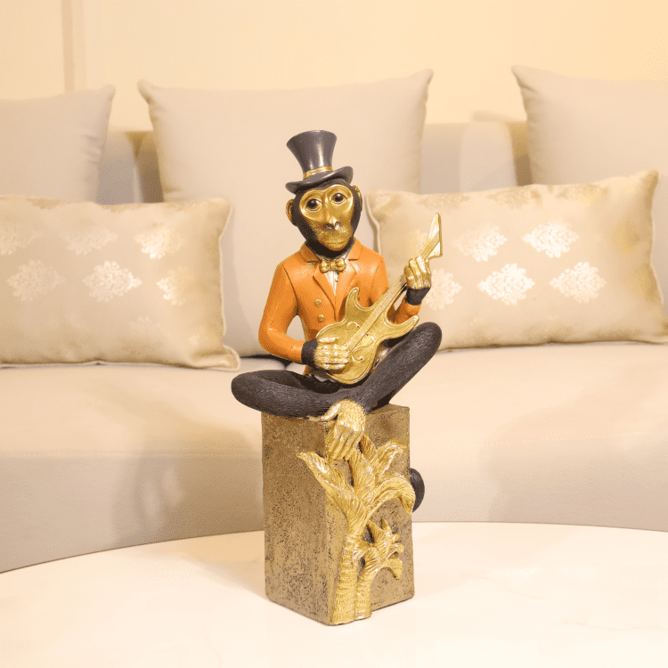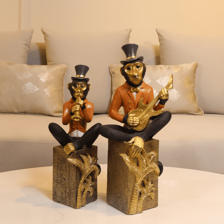 The Musical Monkey Showpiece Set features playful monkey figurines in formal attire, each performing with musical instruments atop ornate gold bases. Paired with abstract art and soft textures, they bring charm and personality to curated shelves.