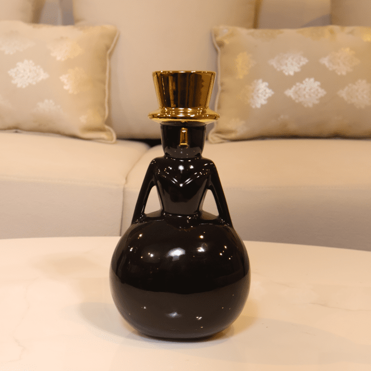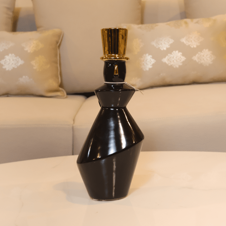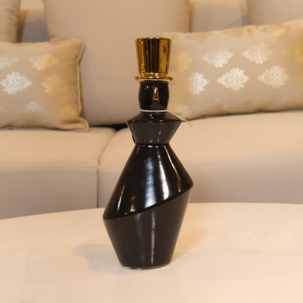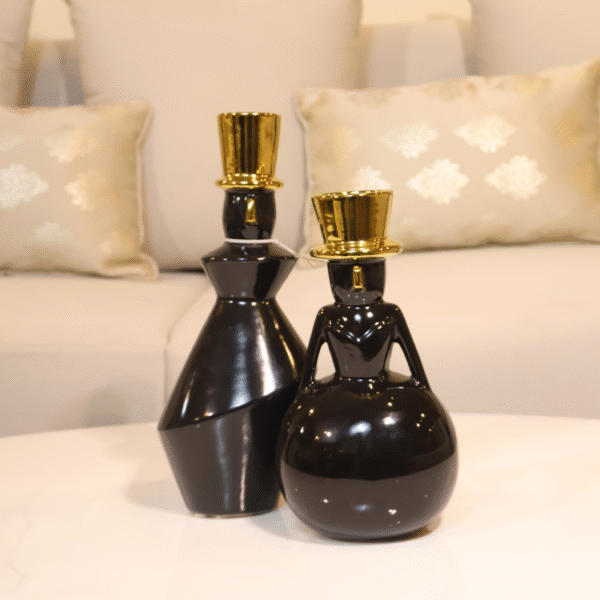 The Obsidian Dandy Duo features glossy black ceramic figures with gold top hats and sculptural forms. Their bold silhouettes and whimsical elegance add artistic flair to modern shelves and curated tabletop arrangements.