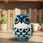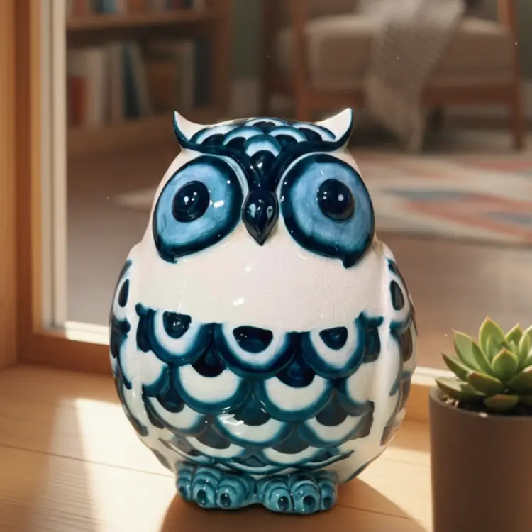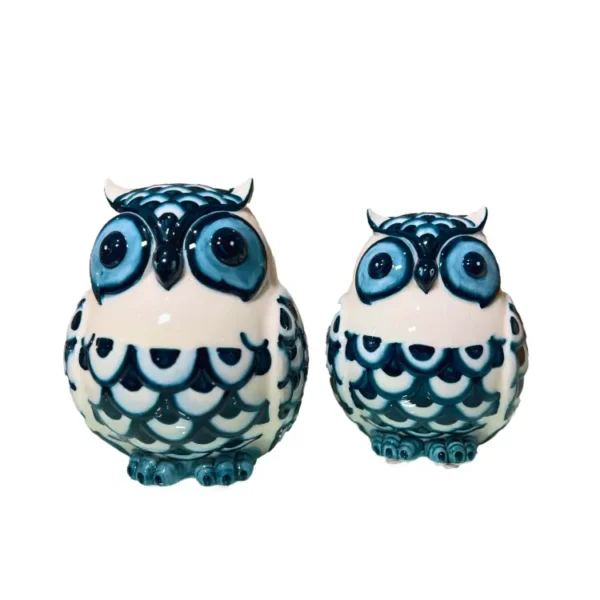 Add a touch of charm and elegance to your space with this handcrafted ceramic owl duo. Featuring intricate blue feather patterns on a glossy white glaze, these figurines symbolize wisdom and serenity