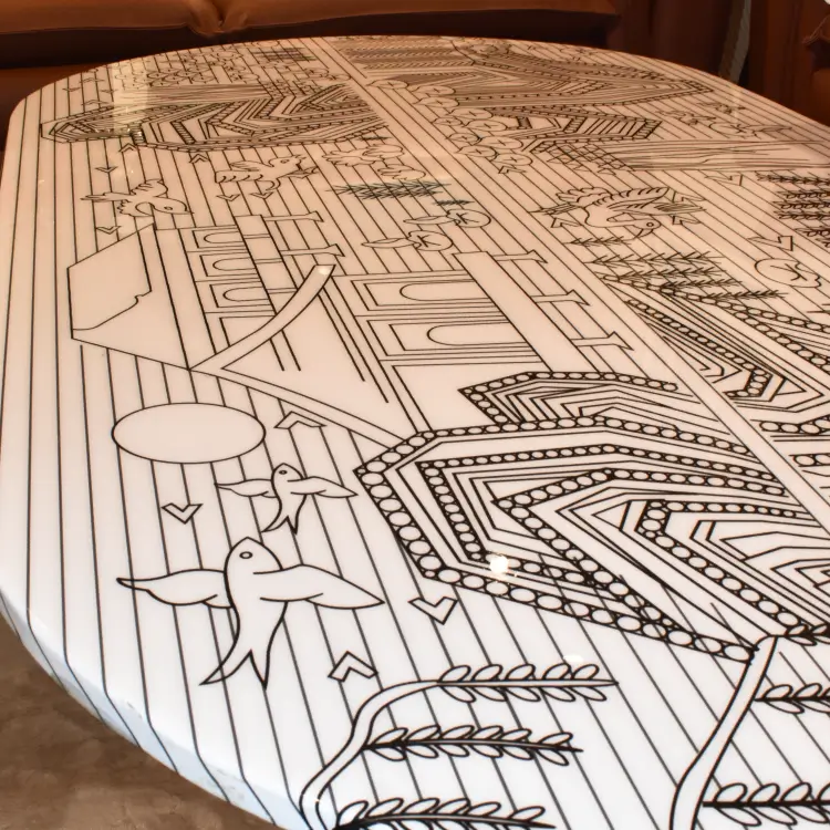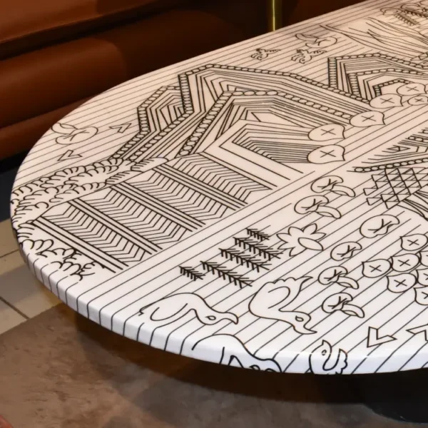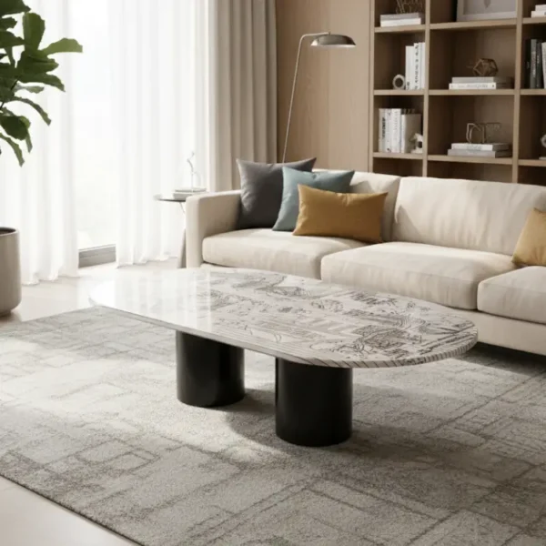 With a textured top and bold black cylindrical legs, the Patterned Oval Coffee Table anchors modern interiors with sculptural flair. Its unique surface adds visual rhythm, pairing effortlessly with neutral palettes and geometric accents.