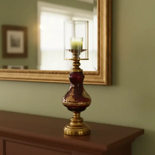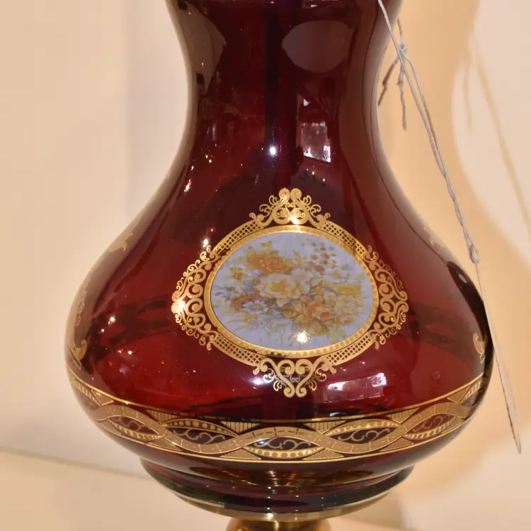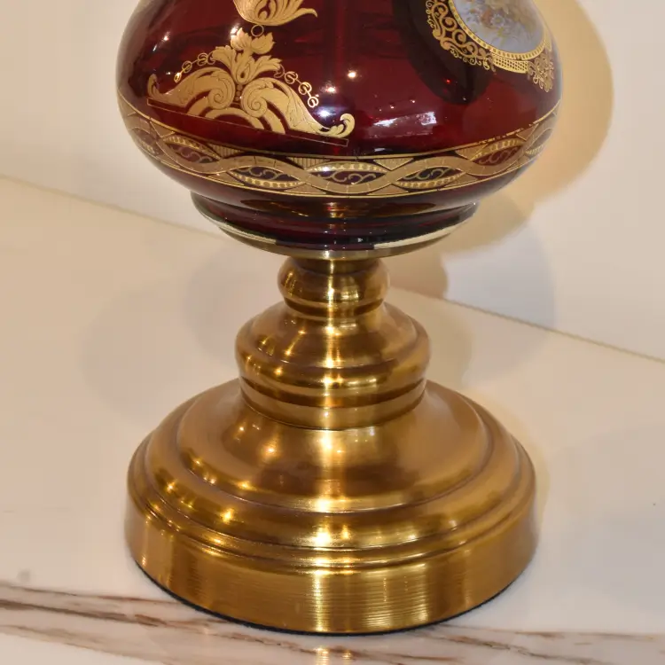 Infuse your space with timeless elegance using the Regency Gold & Red Lamp. This vintage-inspired piece features a deep ruby glass body adorned with intricate gold filigree and a clear hurricane chimney, creating a warm, regal glow for any room.
