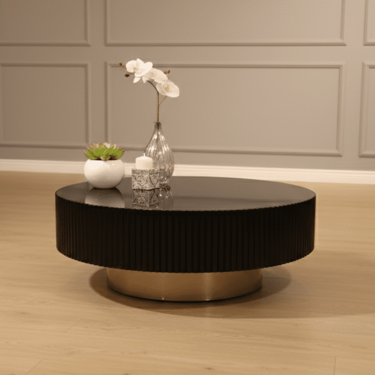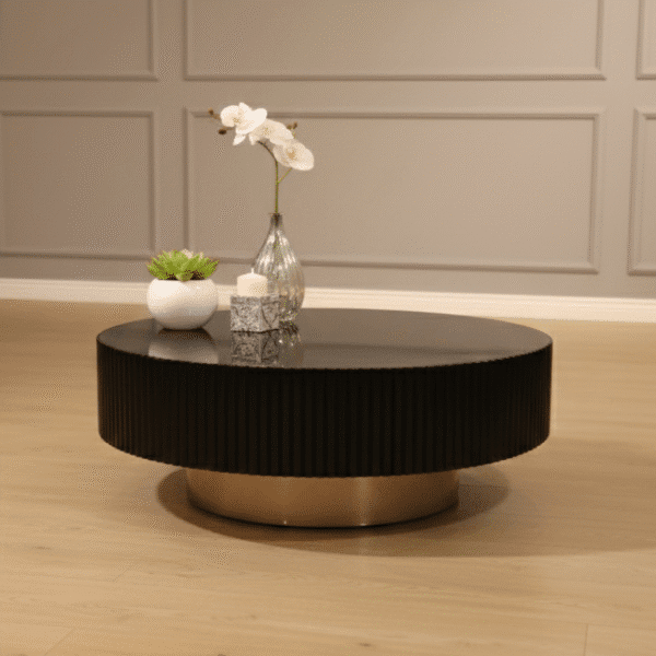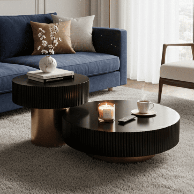 Round coffee tables feature ribbed black bodies with sleek metallic bases, offering sculptural depth and modern utility. A stylish duo for living rooms, they balance minimalism with bold texture and layered functionality.