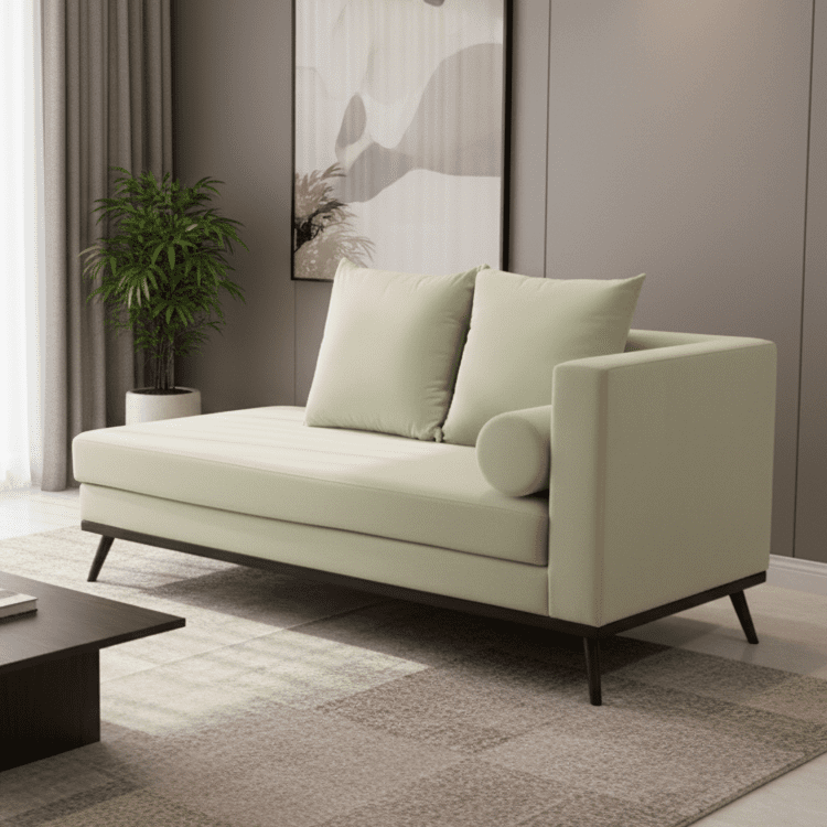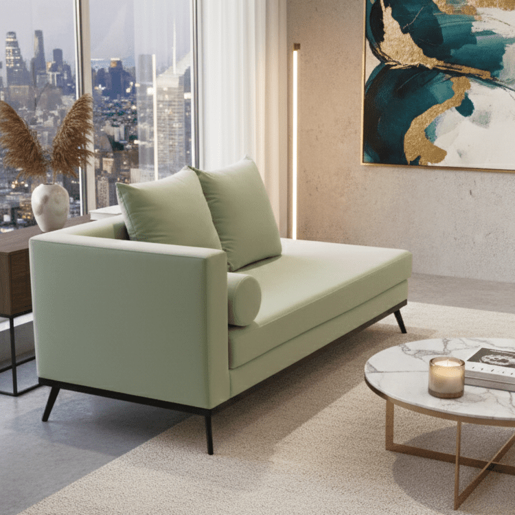 Sage Line Couch blends soft green upholstery with clean contours and black metal legs. Featuring square cushions and a bolster pillow, it offers relaxed elegance for reading nooks, sunlit lounges, or minimalist living rooms.