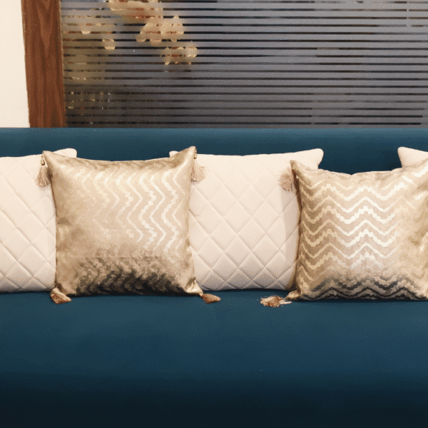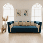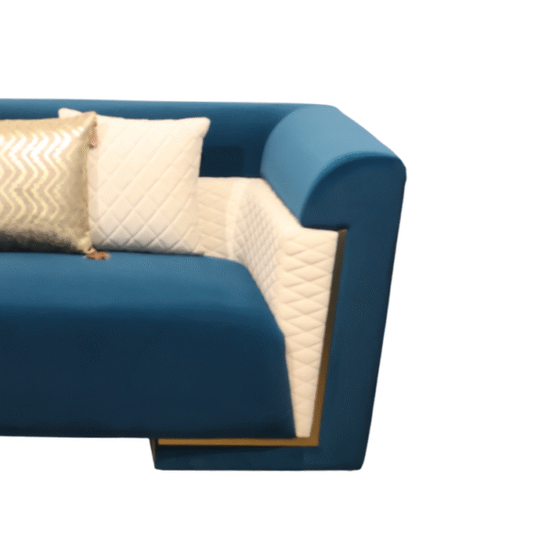 The Signature Luxe Sofa blends bold teal upholstery with quilt-textured ivory panels, offering a modern yet elegant look. Deep seating, plush cushions, and premium craftsmanship make it a perfect centerpiece for stylish living rooms and lounges.
