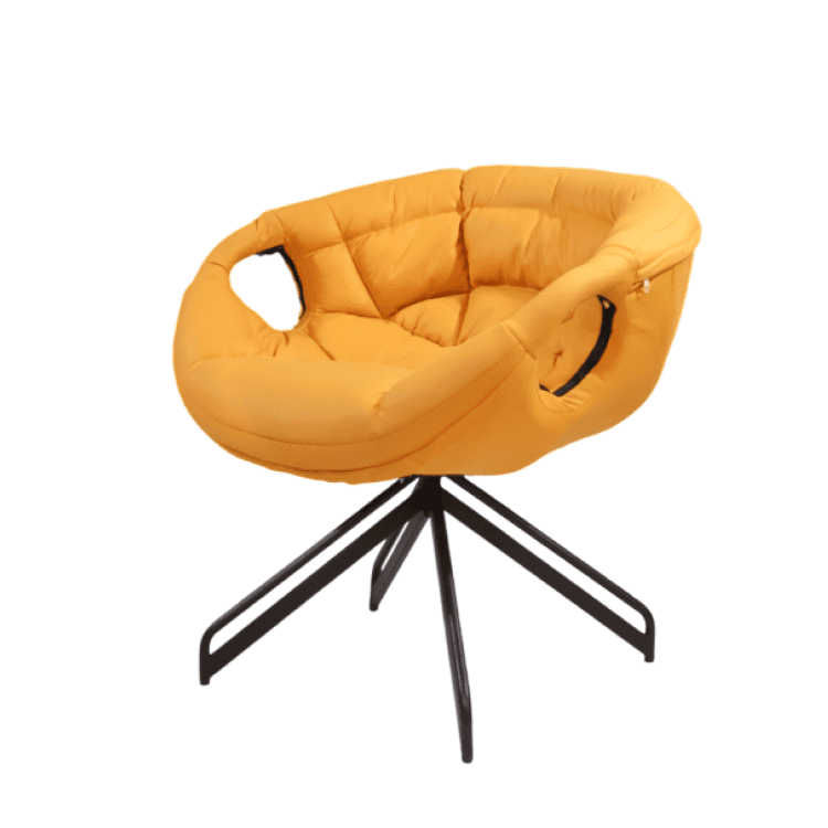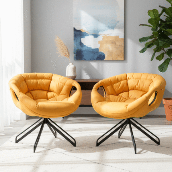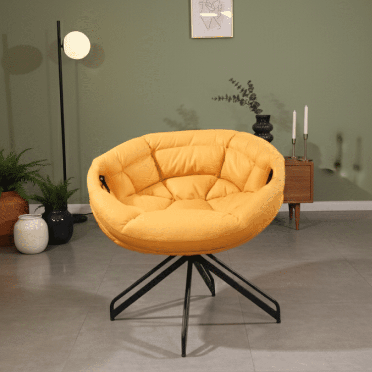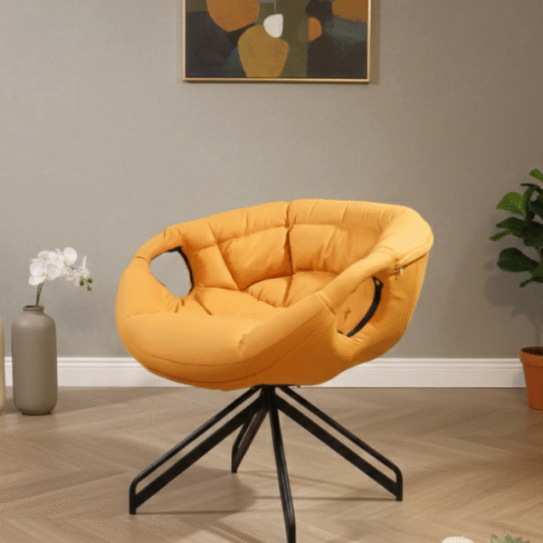 Sunloop Swivel Chair energizes any space with its bold yellow cushioning, curved silhouette, and smooth swivel base. Supported by sleek black metal legs, it’s a perfect blend of comfort, motion, and modern flair.