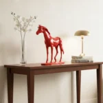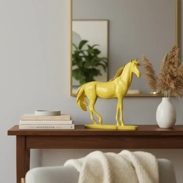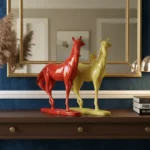 Glossy and bold, these red and yellow horse figurines bring dynamic flair to any console or mantel. Paired with a gold mirror and deep blue backdrop, they create a striking, modern decorative statement.