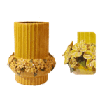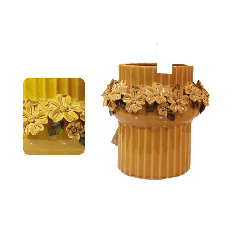 The Flower Ring Vase features a ribbed ceramic design in a warm yellow tone, beautifully accented with a ring of detailed floral motifs. Available in two sizes, it adds charm and elegance to any décor.
